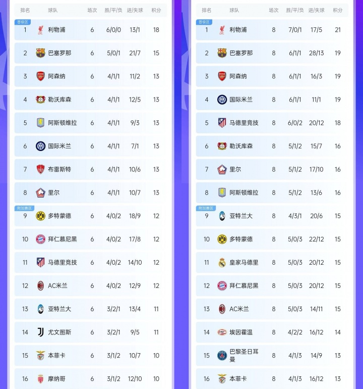 24/25赛季欧冠6轮之后前8:利物浦、巴塞罗那、阿森纳、勒沃库森、阿斯顿维拉、国际米兰、布雷斯特、里尔24/25赛季欧冠8轮之后前8:利物浦、巴塞罗那、阿森纳、国际米兰、马德里竞技、勒沃库森、里尔、